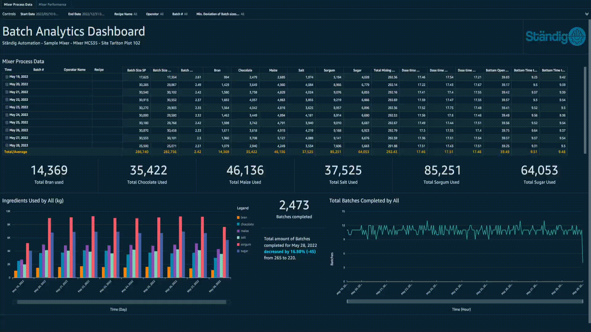 Each batch produced on the factory floor gets stored in a cloud database. This data is then displayed via our Batch Analytics Dashboard where the data is visualized. This dynamic dashboard is custom build according to customer specifications.